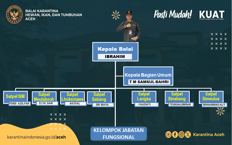 Struktur Organisasi Balai Karantina Hewan, Ikan, dan Tumbuhan Aceh terdiri dari Kepala Balai, Kepala Bagian Umum, serta satuan pelayanan baik di bandara maupun di pelabuhan sebagai bagian dari komitmen untuk terus memberikan layanan karantina yang profesional dan terintegrasi.