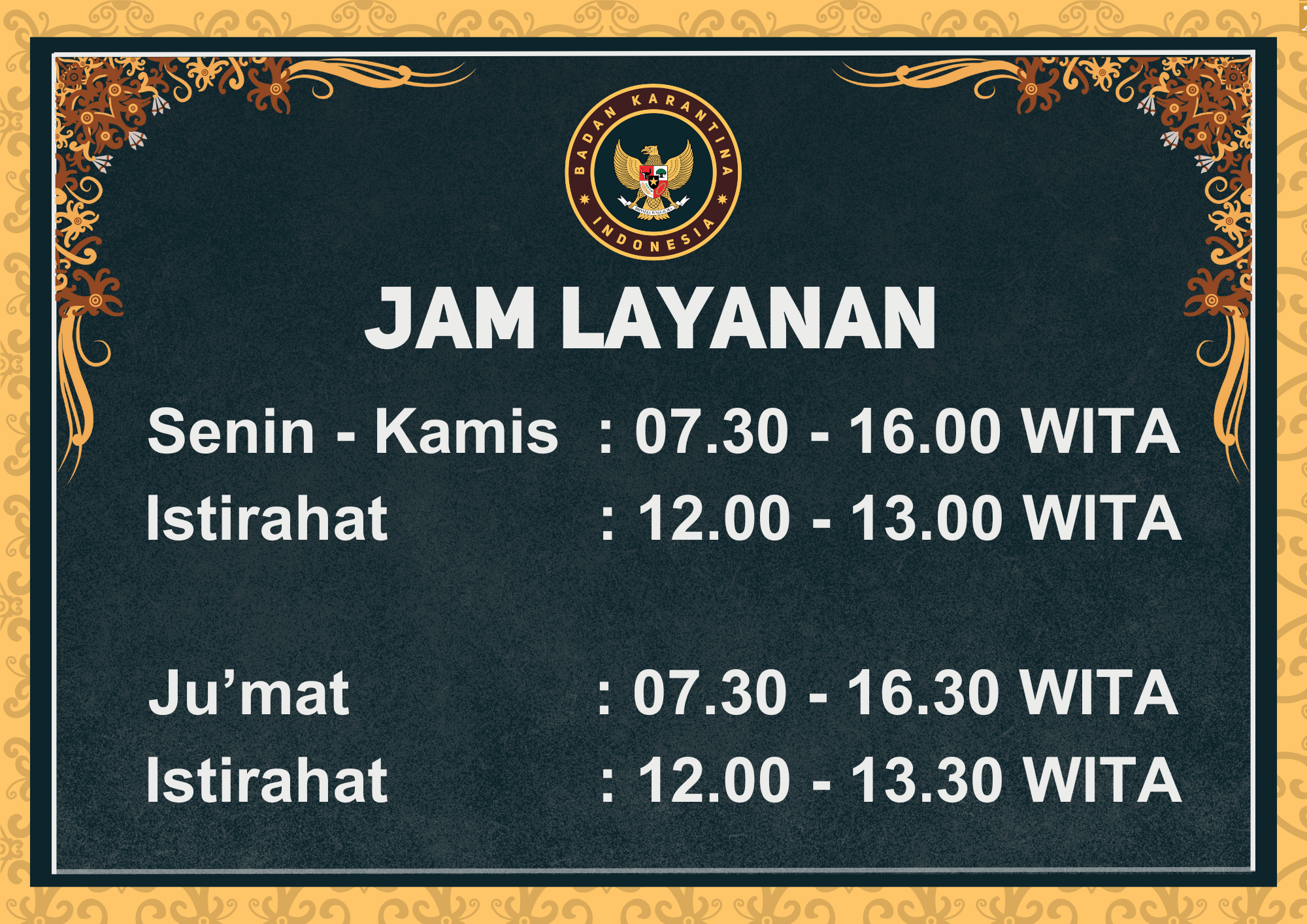 Berikut Jam Layanan Operasional Kantor Balai Besar Karantina Hewan, Ikan dan Tumbuhan Kalimantan Timur