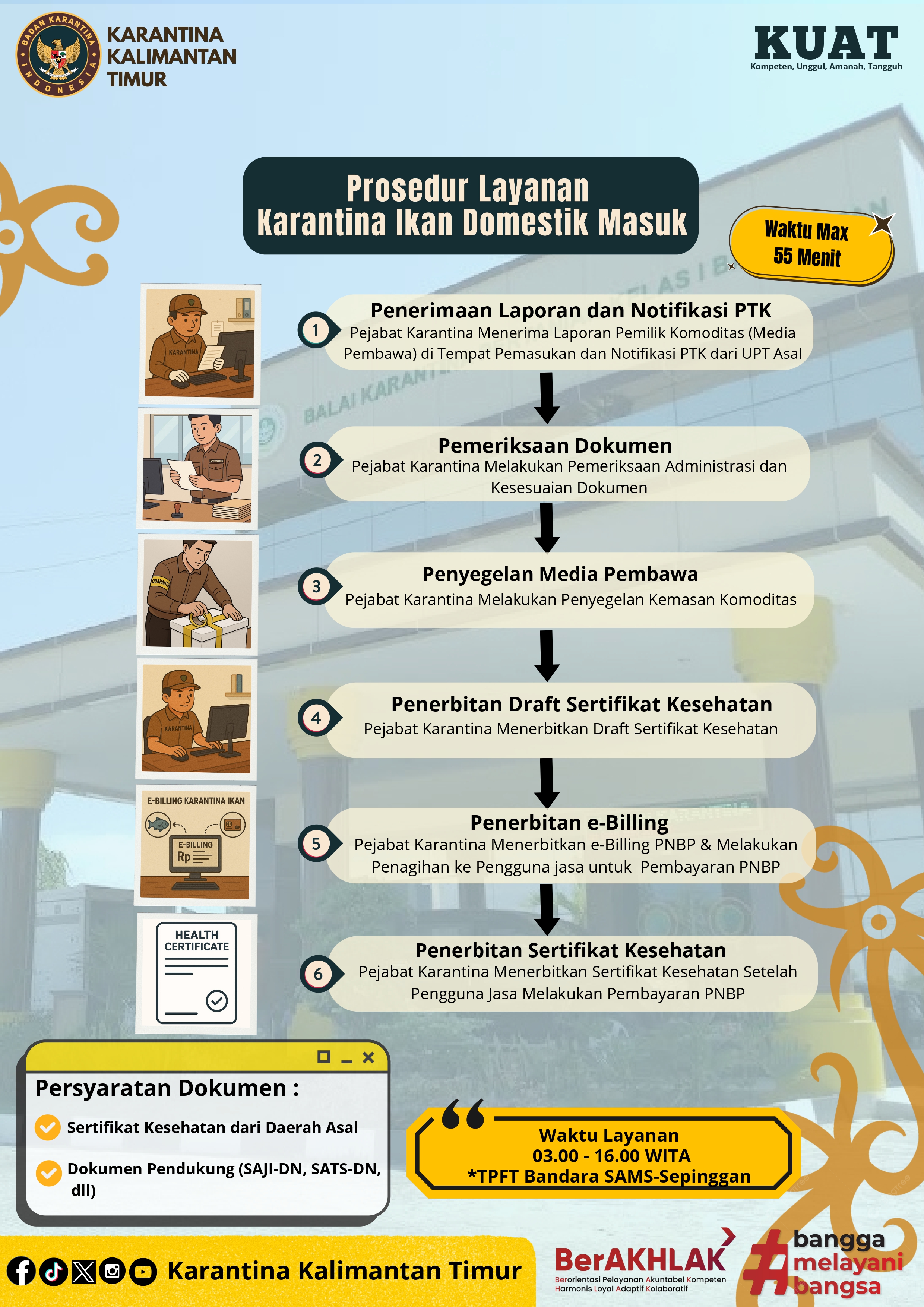 Prosedur Karantina Ikan Domestik Masuk merupakan langkah penting untuk memastikan bahwa media pembawa ikan yang masuk antar wilayah tetap aman, sehat, dan bebas dari hama penyakit ikan. Setiap pengiriman yang dilaporkan akan melalui tahapan sesuai ketentuan yang berlaku. Mengikuti semua rangkaian prosedur Karantina Ikan Domestik Masuk merupakan bentuk Anda ikut menjaga dan mencegah penyebaran hama dan penyakit ikan antar wilayah. Adapun prosedur Karantina Ikan lebih jelasnya dapat di klik di sini.