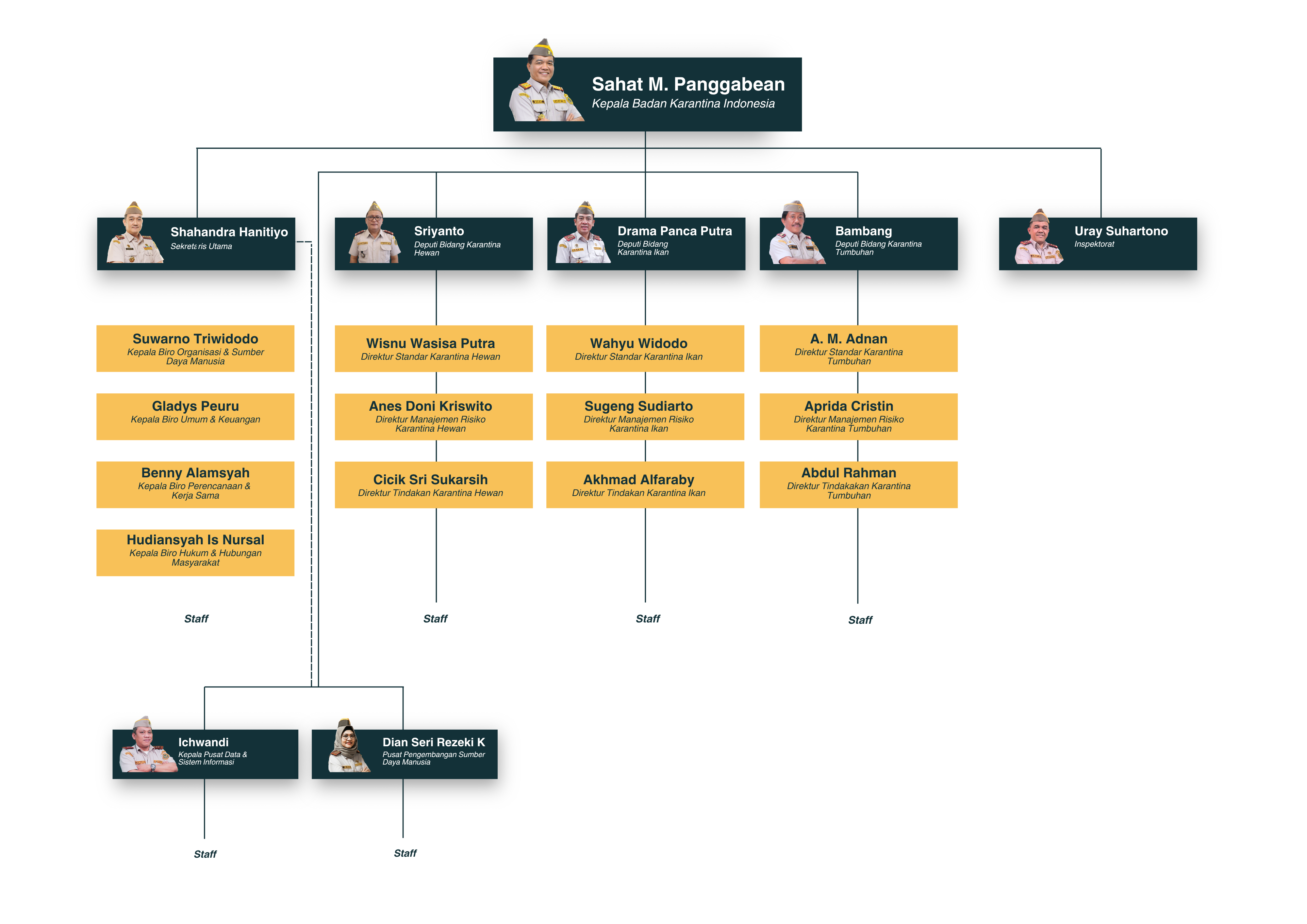 Struktur Organisasi ini menyajikan inti kepemimpinan Balai Karantina Hewan, Ikan, dan Tumbuhan (BKHIT) Kepulauan Riau. Dipimpin oleh Kepala Balai sebagai penanggung jawab tertinggi, dan dibantu oleh Kepala Subbagian Umum dalam hal pengelolaan sumber daya dan administrasi. Posisi-posisi ini menjadi kunci dalam menggerakkan seluruh fungsi perkarantinaan di wilayah Kepulauan Riau.