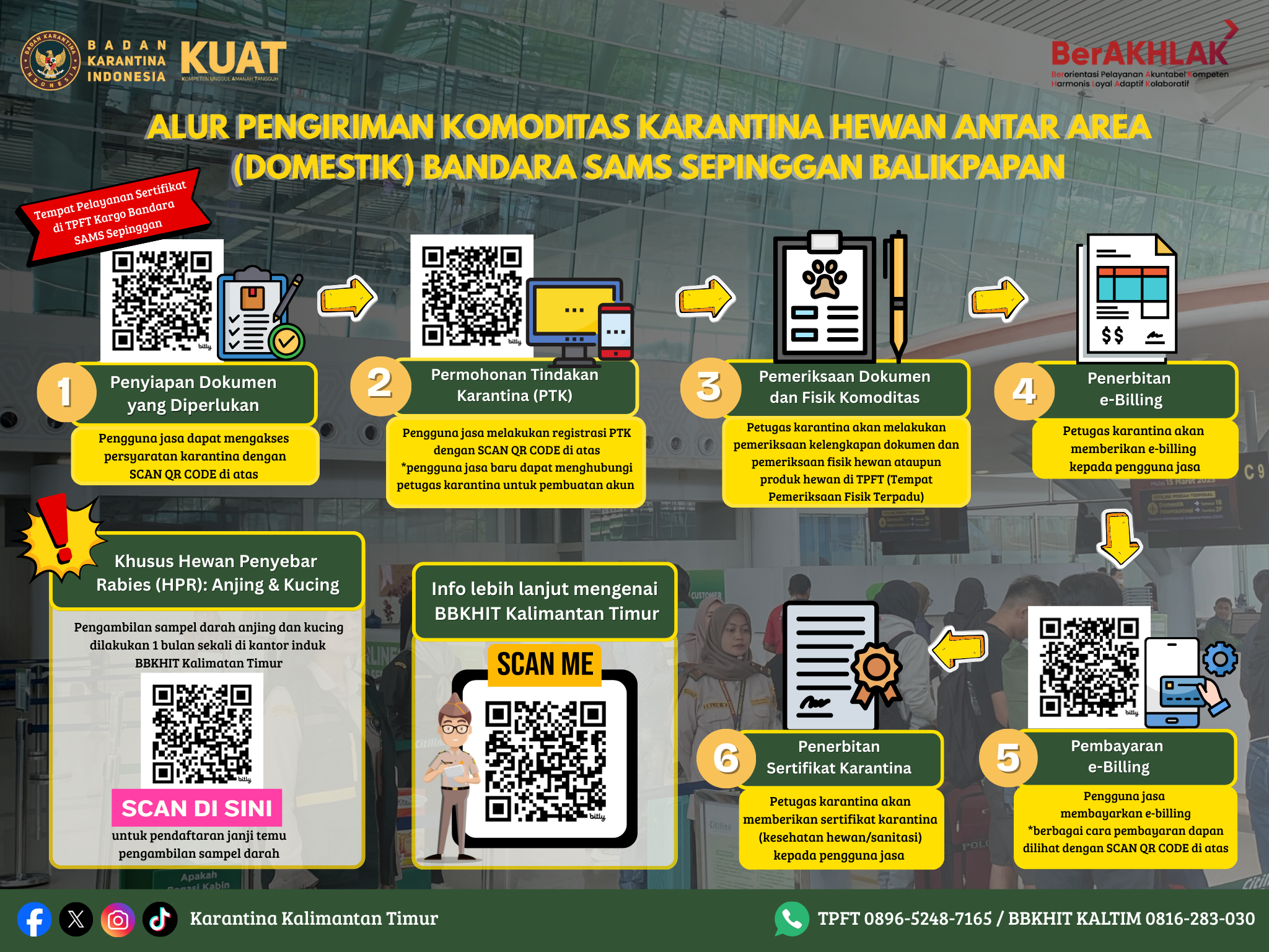 Prosedur Karantina Hewan merupakan langkah penting untuk memastikan hewan yang masuk dan keluar tetap aman, sehat, dan bebas dari hama penyakit. Setiap hewan yang akan dibawa atau dikirim serta diterima perlu melewati proses Karantina sesuai aturan yang berlaku dengan mengikuti setiap langkah prosedur yang tercantum. Mengikuti semua rangkaian prosedur Karantina Hewan merupakan bentuk Anda ikut menjaga kesehatan hewan serta mencegah penyebaran penyakit antar wilayah. Adapun prosedur Karantina Hewan lebih jelasnya dapat di klik di sini.