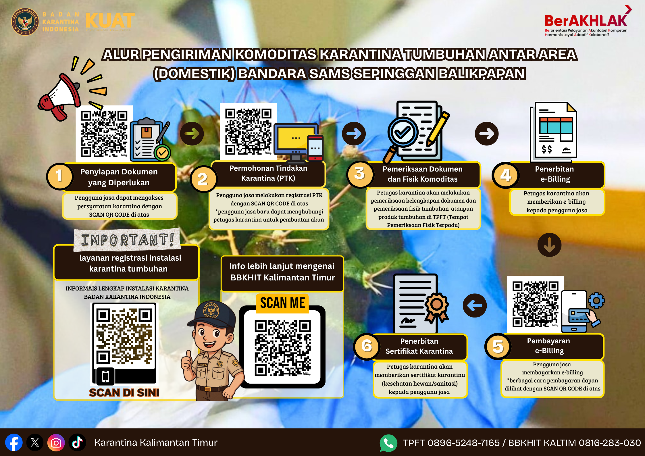 Prosedur Karantina Tumbuhan merupakan langkah penting untuk memastikan media pembawa tumbuhan yang masuk dan keluar tetap aman dan bebas dari hama atau organisme pengganggu tumbuhan. Proses pemeriksaan oleh Karantina dilakukan agar dapat melakukan penerbitan sertifikat dan memastikan bahwa seluruh persyaratan sudah terpenuhi. Mengikuti semua rangkaian prosedur Karantina Tumbuhan merupakan bentuk Anda ikut menjaga dan mencegah penyebaran hama dan organisme pengganggu tumbuhan antar wilayah. Adapun prosedur Karantina Tumbuhan lebih jelasnya dapat di klik di sini.